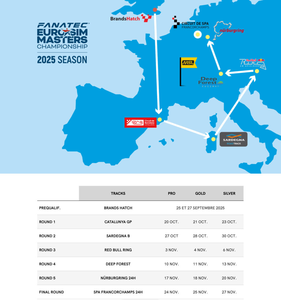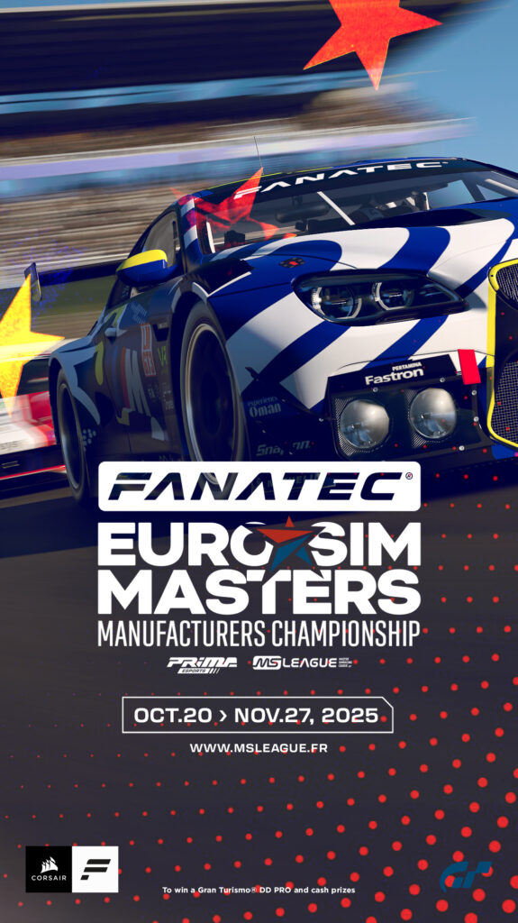 Le Fanatec® Eurosim Masters Championship est un championnat de simracing en ligne organisé par MSLeague et Eludis, en partenariat avec Fanatec® et Corsair. Réunissant les meilleurs pilotes PlayStation sur Gran Turismo 7, il propose un format compétitif et accessible, avec 3 splits de 14 pilotes répartis par niveau à l’issue de préqualifications. Deux pilotes par split représenteront un même constructeur: Porsche, BMW, AMG, Lamborghini, Lexus, Renault, Aston Martin. Cette compétition, placée sous le signe du fairplay et de l’exigence sportive, offre un cash prize pour la prime constructeur qui récompensera les 6 pilotes du constructeur champion (classement constructeurs), et un volant Fanatec GT DD Pro 8N au pilote champion (Classement pilotes) et un trophée spécial au pilote Fanatec de la compétition soumis aux votes de la communauté.